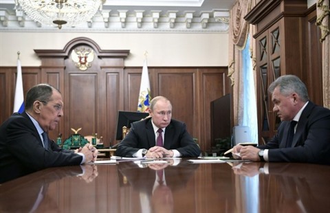 | Le président russe Vladimir Poutine en compagnie de ses ministres des Affaires étrangères, Sergueï Lavrov (gauche), et de la Défense, Sergueï Choïgou (droite), le 2 février à Moscou. |