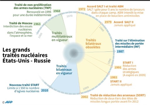 Les deux puissances s'accusent mutuellement de violer le traité sur les armes nucléaires de portée intermédiaire (INF) signé à la fin de la Guerre froide, en 1987. Ce texte abolit l'usage - par eux seuls - des missiles terrestres d'une portée de 500 à 5.500 km.