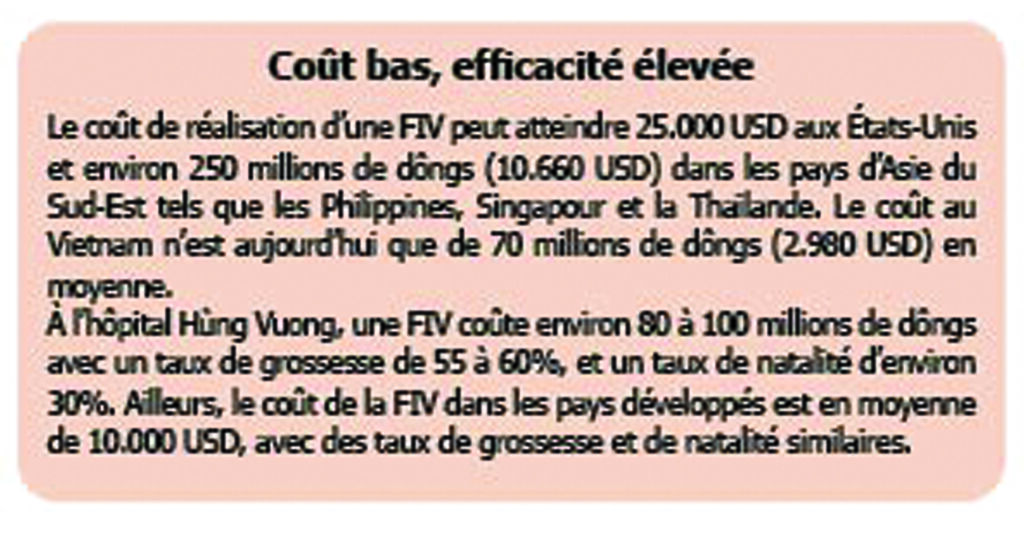 D’après le médecin Hô Manh Tuong, chef du Département de soutien à la fertilité de l’hôpital My Duc, la technologie de reproduction assistée au Vietnam s’est développée très rapidement au cours des dix dernières années. Actuellement, le Vietnam met en pratique avec succès toutes les techniques modernes de procréation assistée dans le monde. C’est le pays qui pratique le plus la FIV dans la région de l’ASEAN avec le taux de réussite le plus élevé et le coût le plus bas.