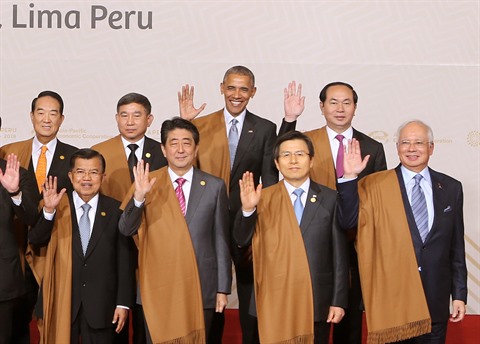 | Le président vietnamien Trân Dai Quang (2e plan, 1er à droite) et des dirigeants des économies membres de l'APEC, le 20 novembre à Lima, au Pérou. |