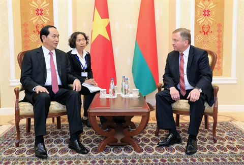 En rencontrant le Premier ministre biélorusse, le président Trân Dai Quang a affirmé que le gouvernement vietnamien donnera des conditions optimales à ce joint-venture Vietnam - Bélarus. Il a souhaité que les deux pays réalisent davantage de projets dans divers secteurs, dont la transformation de produits agricoles, la fabrication de machines et la construction d’infrastructures. Il a également assuré que le Vietnam était prêt à jouer le rôle de «passerelle» entre le Bélarus et l’ASEAN (Association des nations de l’Asie du Sud-Est). Remerciant le Bélarus pour le soutien de la diaspora vietnamienne, il a demandé au gouvernement biélorusse de continuer de favoriser les sorties et les entrées des Vietnamiens sur son sol.