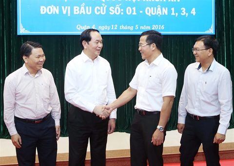 | Le président Trân Dai Quang (2e à gauche) rencontre des électeurs de Hô Chi Minh-Ville, le 12 mai dans la mégapole du Sud. |
