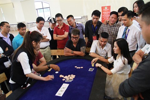 | Trân Duc Ngoc (en cravate) anime l’atelier de formation au poker, le 22 mai 2017 à Hô Chi Minh-Ville. |