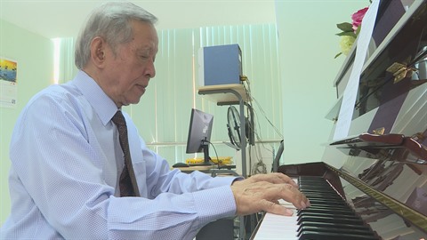 | Le compositeur Trân Long Ân interprète sa chanson au piano. |