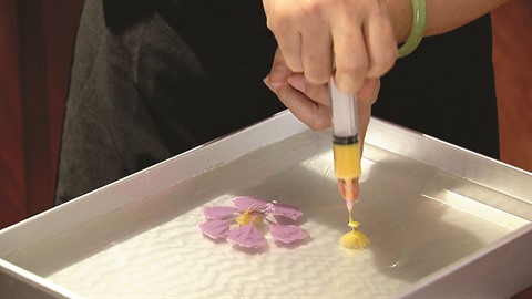 Si la première sert de fonds (couche inférieure), la deuxième (couche supérieure, partie la plus importante du gâteau) est réservée à l’injection des couleurs pour créer les sculptures et les motifs désirés. Il faut ensuite préparer les liquides de différentes couleurs qui seront injectés dans la gelée à l’aide de seringues dans le but de créer les fameuses sculptures 3D à l’intérieur du gâteau. Cette technique, qui dépend du talent de chaque pâtissière, permet d’obtenir des motifs de décorations variés tels que fleurs, feuilles, plantes, animaux, paysages ou n’importe quel thème de prédilection, il n’y a pas de limites.