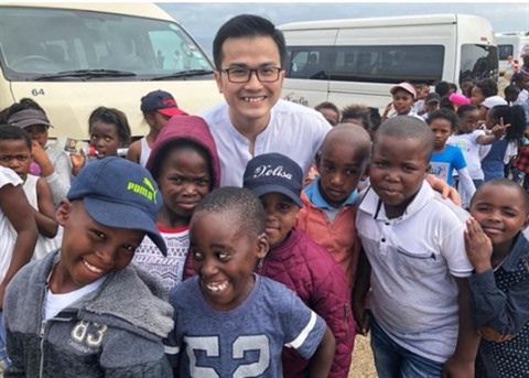 | Trân Xuân Bach (aux lunettes), en compagnie d'enfants en Afrique du Sud. |