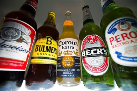 | Photo prise le 13 octobre de bouteilles de bière Budweiser, Corona et Beck's du groupe Anheuser-Busch InBev et de bouteilles de Peroni et Bulmers propriétés de SABMiller. |