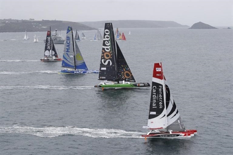 | Les trimarans Sodebo et Macif, ainsi que leurs concurrents, lors du départ de la Transat anglaise à Plymouth, le 2 mai. |