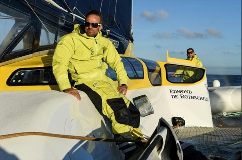 | Les skippers Franck Cammas et Charles Caudrelier, juchés sur le voilier "Edmond de Rothschild", entre Lorient et Le Havre le 27 octobre, à dizaine de jours du départ de la Transat Jacques Vabre. |