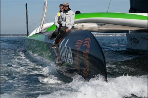 | Les skippers Thomas Coville (droite) et Thomas Rouxel à bord du voilier "Sodebo", le 12 octobre, au large de Lorient, à quelques semaines de leur départ pour la Transat Jacques Vabre. |