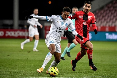 | L'attaquant de l'OM, Marley Aké (gauche), à la lutte avec Wesley Lautoa, lors d'un match à Dijon, le 9 janvier. |