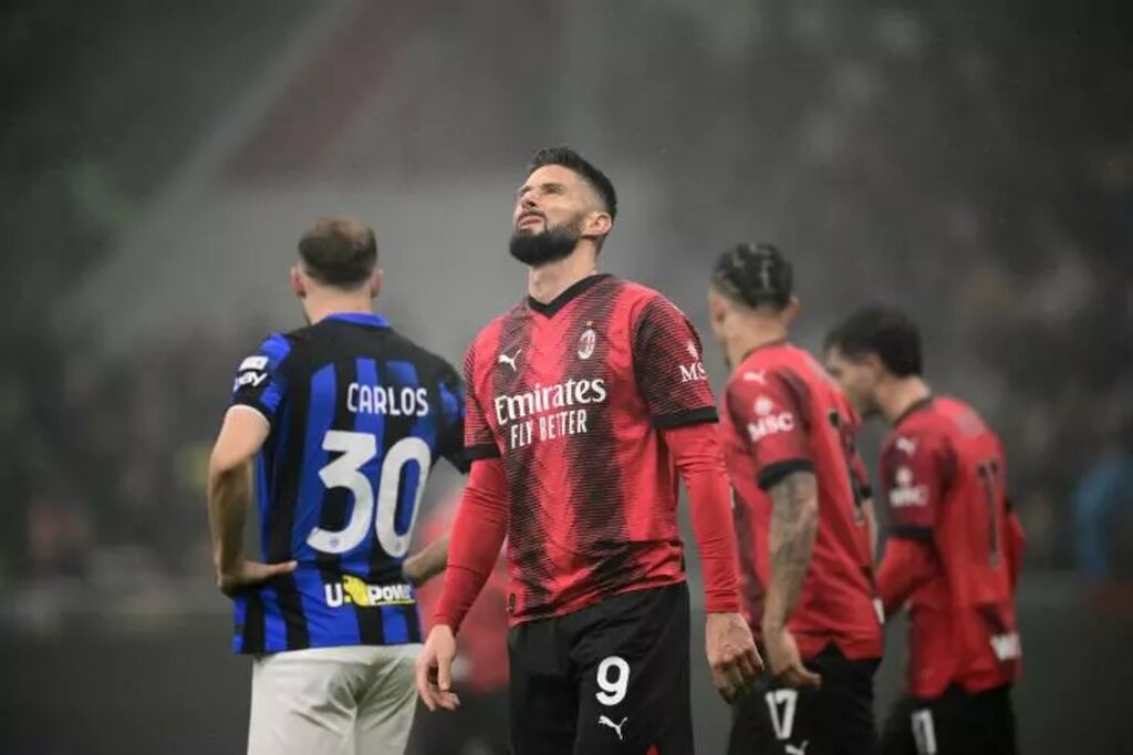 | Olivier Giroud le 22 avril lors de la défaite du Milan AC (2-0) face à l'Inter, synonyme de titre pour les Nerazzurri. |