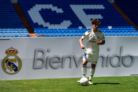 | Le jeune défenseur espagnol Alvaro Odriozola lors de sa présentation officielle au Real Madrid, le 18 juillet à Bernabeu. |
