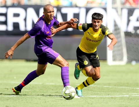 | Le Brésilien Fabinho (gauche) évolue désormais à Liverpool, ici opposé au Borussia Dortmund, le 22 juillet à Charlotte, en Caroline du Nord. |