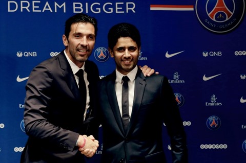 | L'emblématique gardien Gianluigi Buffon (gauche) est officiellement présenté au PSG par son président Nasser Al-Khelaïfi, le 9 juillet à Paris. |