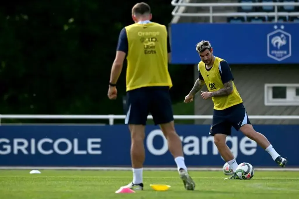 | Théo Hernandez (face), à l'entraînement avec les Bleus peu avant la demi-finale de Ligue des nations, le 31 mai à Clairefontaine. |