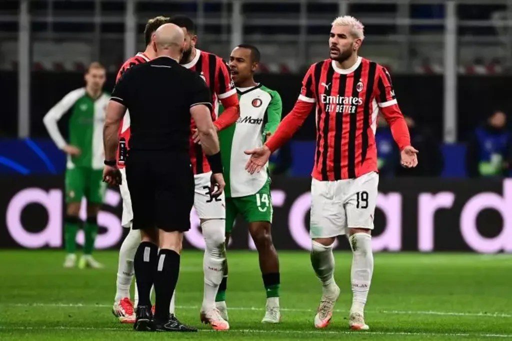 | Théo Hernandez exclu lors du barrage retour de Ligue des champions contre le Feyenoord à Milan, le 18 février. |