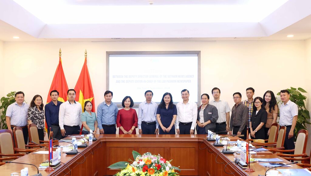| Des représentants de l’Agence Vietnamienne d’Information et du journal lao Pasaxon lors de la séance de travail. |