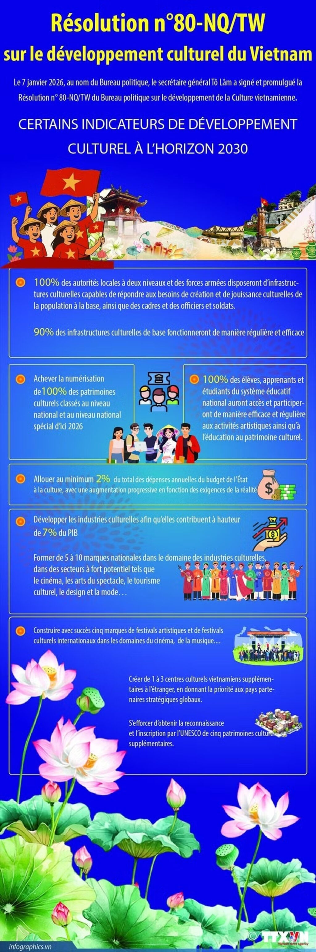 "Si nous atteignons ces objectifs, ou au moins les deux tiers, cela contribuera déjà à stimuler de manière significative le développement des industries culturelles au Vietnam. Par exemple, lorsque 100% des types de patrimoine culturel seront numérisés et normalisés selon le cadre national, les ressources culturelles pourront être largement partagées et mises au service de la population, des entreprises et de la société. Les acteurs de la création et de la production de produits culturels - tels que le cinéma, les arts de la scène, les jeux vidéo ou le tourisme culturel - pourront accéder à un vaste réservoir de données sur l’histoire, les arts populaires, les costumes, la musique traditionnelle, des patrimoines aujourd’hui dispersés et difficiles d’accès", analyse Nguyên Hưng Quang.