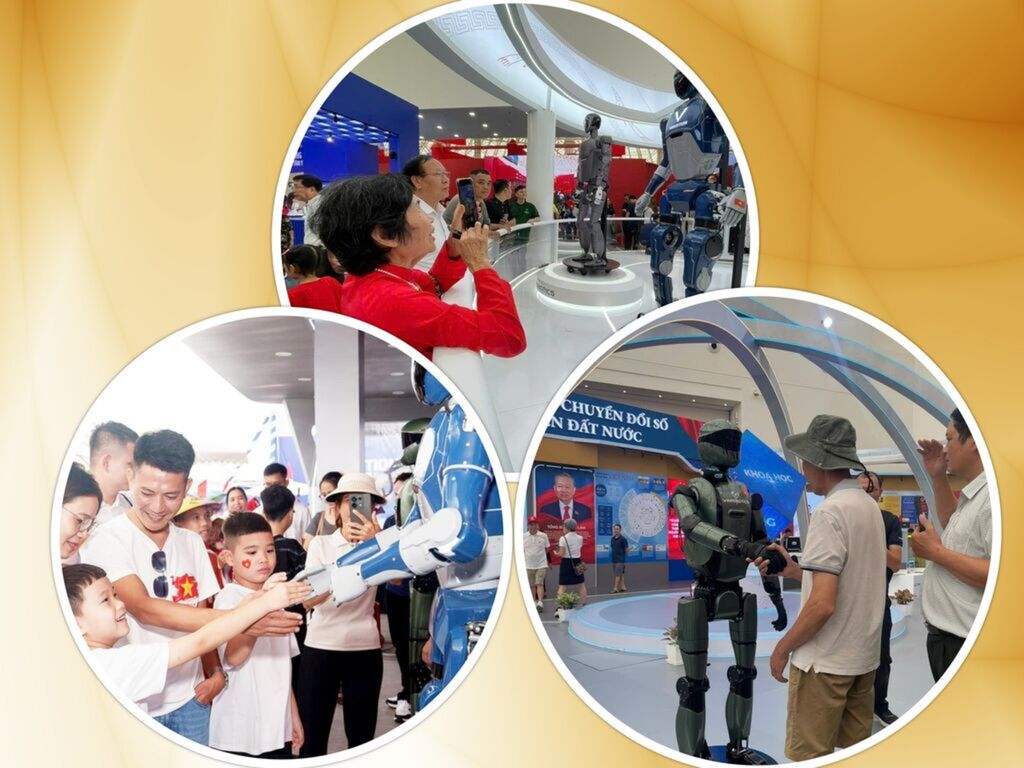 | Les visiteurs interagissent avec le robot VinMotion lors de l’Exposition des réalisations nationales "80 ans de parcours vers l'indépendance, la liberté et le bonheur". |