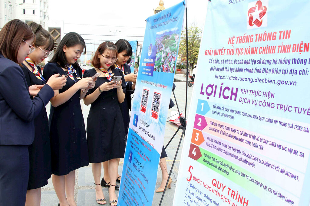 | Les fonctionnaires et employés des organes de la province de Diên Biên (Nord) installent l'application "Diên Biên Smart" et utilisent les services publics en ligne. |