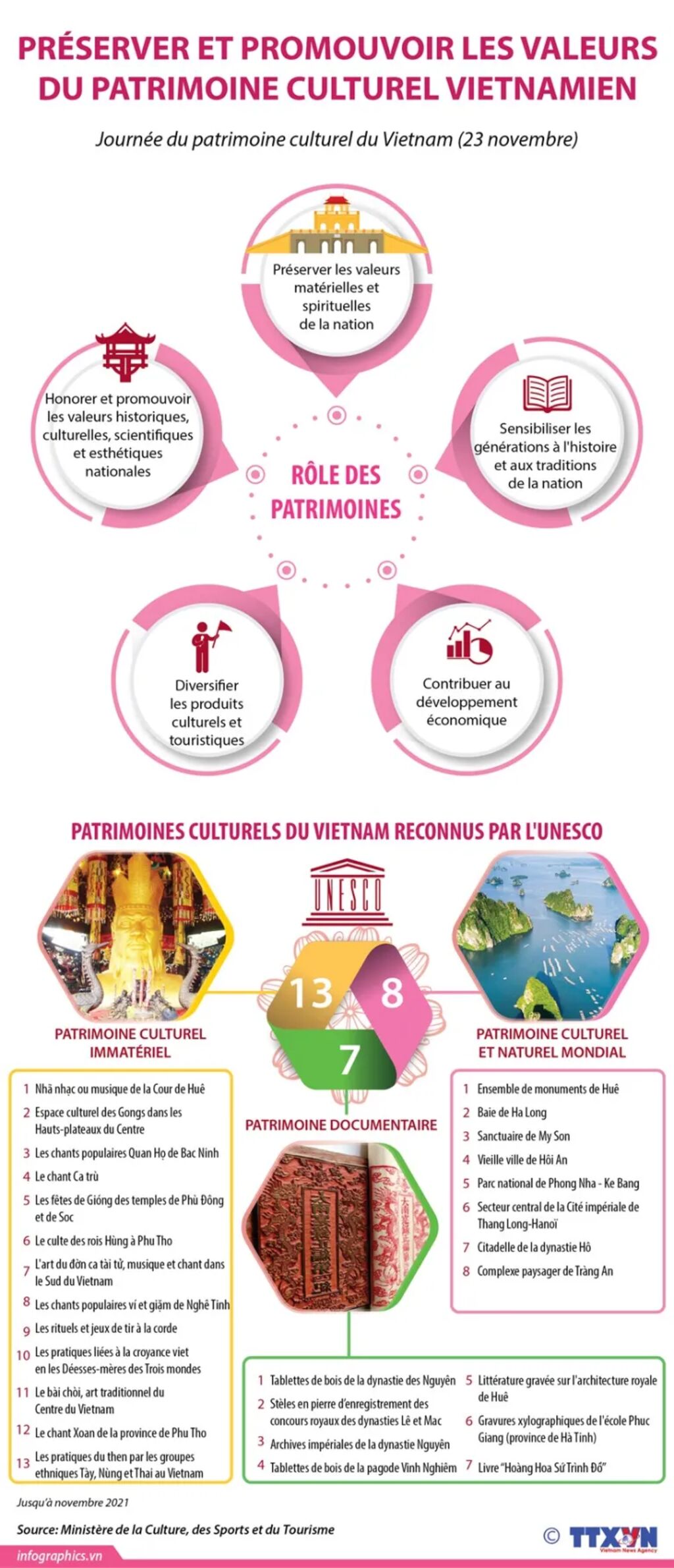 Le plus remarquable du système patrimonial du pays est ses neuf sites du patrimoine mondial, dont cinq sites du patrimoine culturel que sont le complexe des monuments de Huê, l’ancienne ville de Hôi An, le sanctuaire de My Son, la citadelle de Thang Long, la citadelle de la dynastie des Hô ; trois patrimoines naturels que sont le parc national de Phong Nha-Ke Bàng, la baie d'Ha Long, le complexe baie Ha Long-archipel de Cat Bà ; et un patrimoine mixte : le complexe paysager pittoresque de Tràng An.