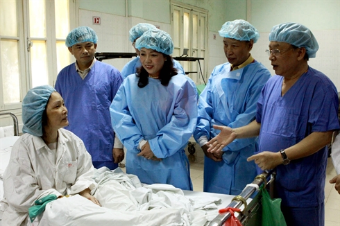 | La ministre de la Santé, Nguyên Thi Kim Tiên, rend visite à l’un des patients ayant reçu l’un des organes d’un donneur en état de mort cérébrale, opérations réalisées à l’hôpital Viêt Duc (Hanoi) en juillet 2013. |