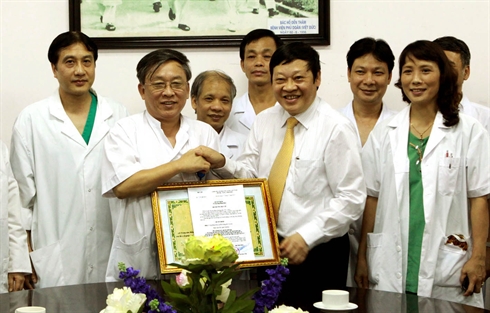 | Le vice-ministre de la Santé, Nguyên Viêt Tiên (avec la cravate), remet en juillet 2013 le satisfecit à la direction de l’hôpital Viêt-Duc et à l’équipe ayant réalisé les transplantations d’organes d’un donneur en mort cérébrale pour sauver la vie de quatre personnes. |