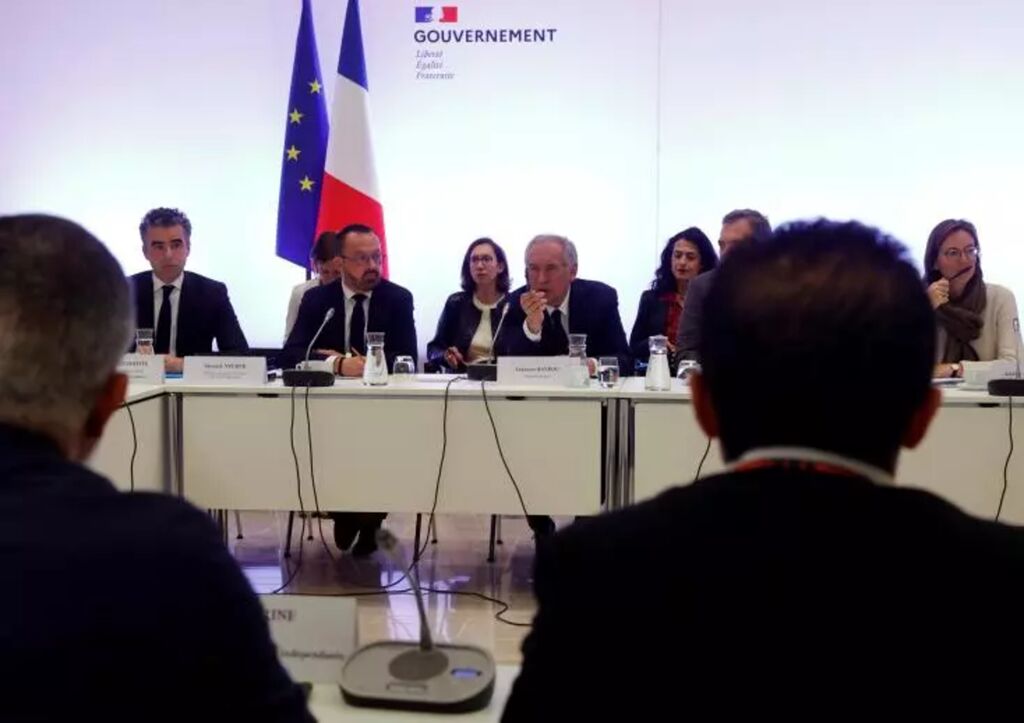 | Le Premier ministre François Bayrou (centre) lors d'une réunion avec des représentants des chauffeurs de taxi au ministère des Transports à Paris, le 24 mai. |