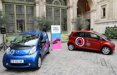 | Voitures électriques en libre service Free2Move du groupe PSA, à Paris, le 29 novembre 2018. |