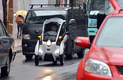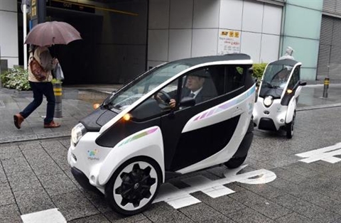 | Une voiture i-road mise au point par Toyota circule dans les rues de Tokyo le 7 avril. |
