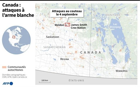 La police avait reçu un premier appel dimanche 4 septembre à 05h40 heure locale (11h40 GMT) faisant état d'une attaque à l'arme blanche à James Smith Cree Nation, suivie d'autres.