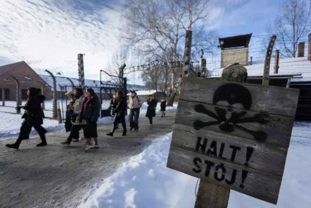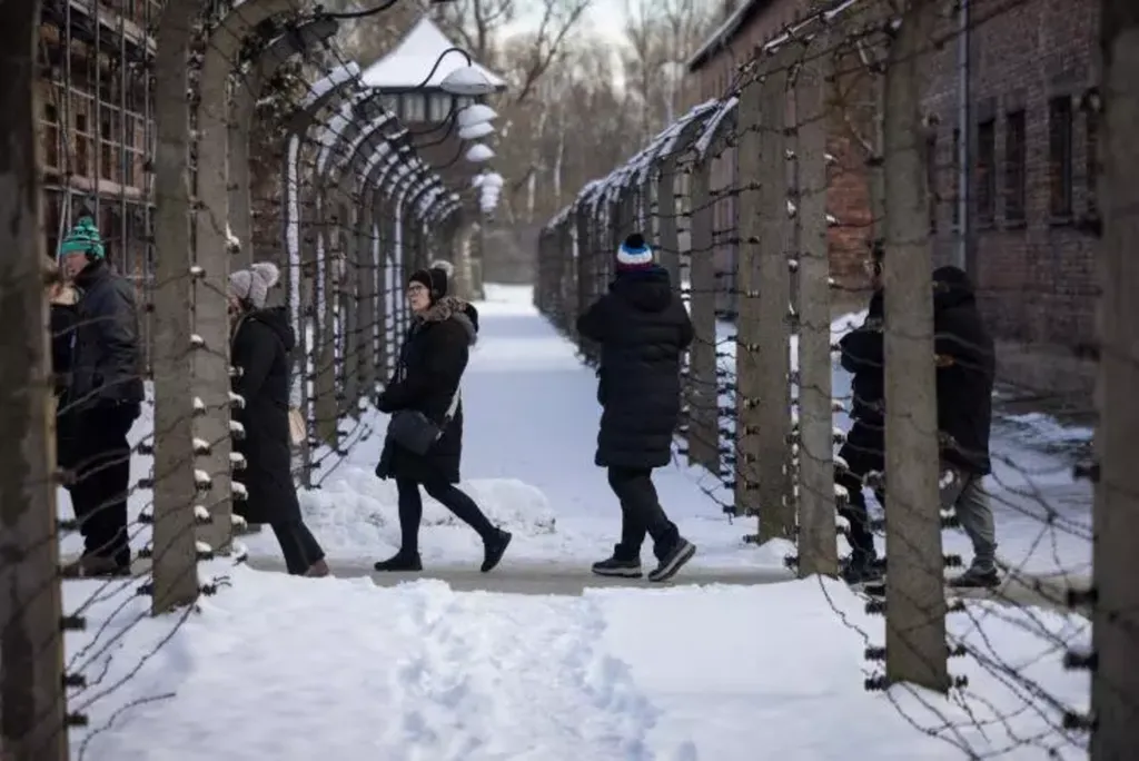 | Des visiteurs du musée de l'ancien camp nazi d'Auschwitz-Birkenau, le 14 janvier 2025 dans la ville polonaise d'Oswiecim. |