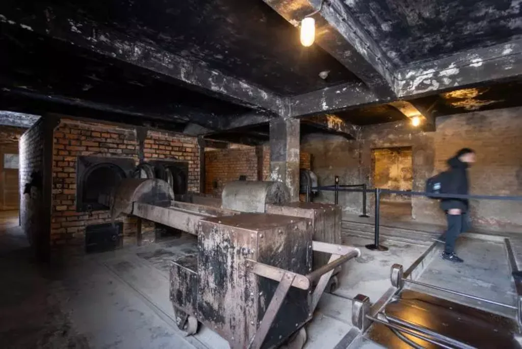 Derrière le bâtiment se dressent une ancienne chambre à gaz et un four crématoire. Plus loin, se dessine le tristement célèbre portail surmonté de l'inscription "Arbeit macht frei" ("Le travail rend libre", ndlr) de ce camp libéré par l'Armée rouge il y a 80 ans, le 27 janvier 1945.