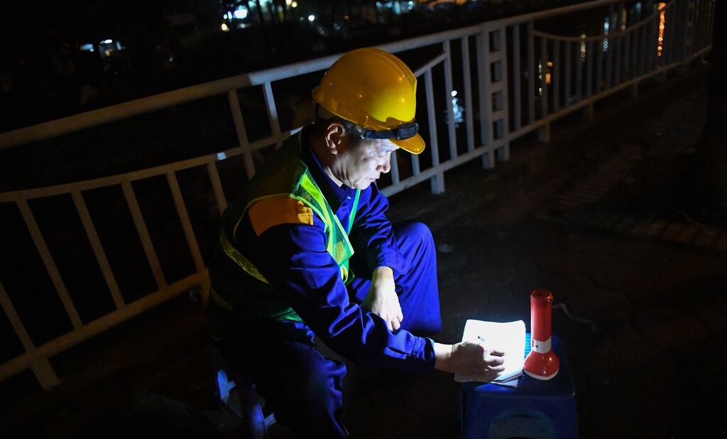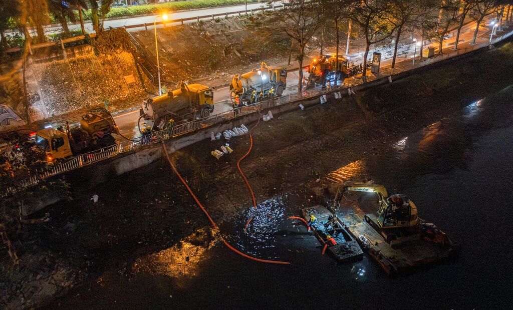 | À 1h du matin, les projecteurs des pelleteuses illuminent toujours la rivière. Sous une pluie battante et un froid persistant, les ouvriers poursuivent leur labeur avec persévérance. |