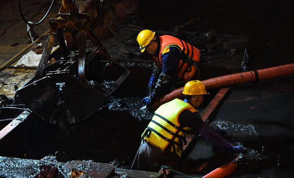| À minuit, les ouvriers pataugent encore dans l’eau noire, tandis que quatre pelleteuses poursuivent inlassablement leur travail sur les barges. |