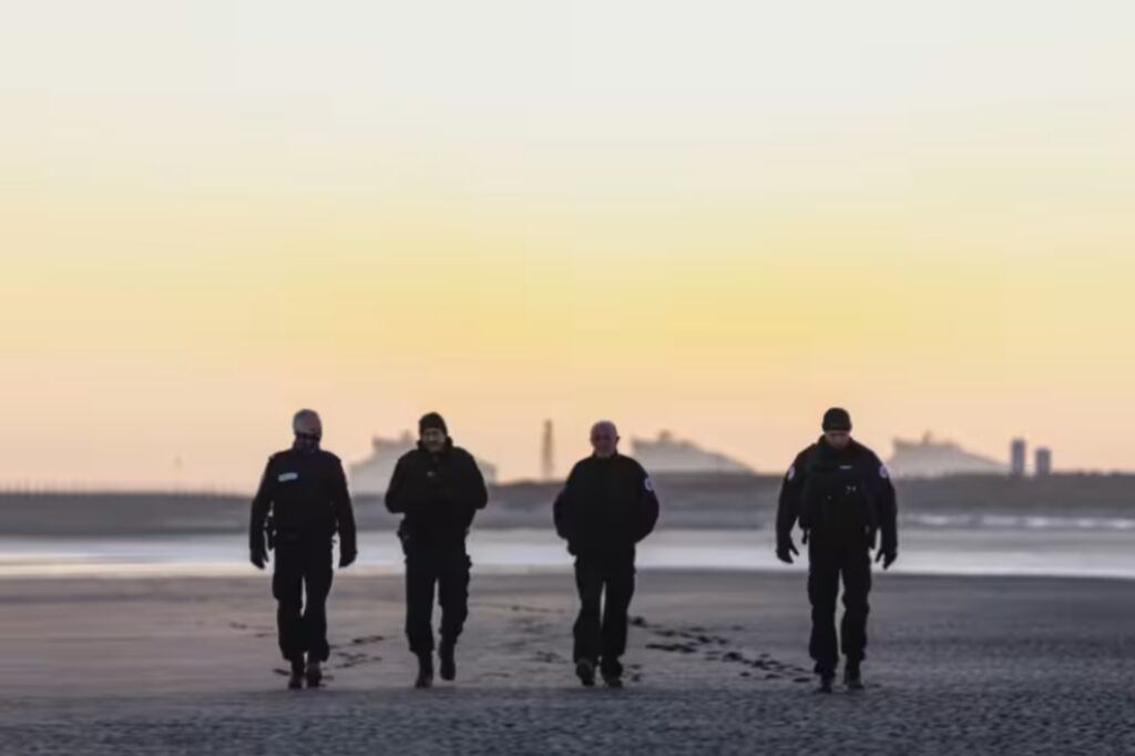 | Des policiers français patrouillent sur la plage de Gravelines au lever du soleil afin d'empêcher les migrants de traverser la Manche, à Gravelines, dans le Nord de la France, le 14 avril. |