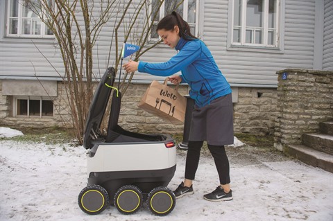 | Une femme reçoit des aliments d’un robot fabriqué par Starship Technologies à Tallinn, en Estonie. |