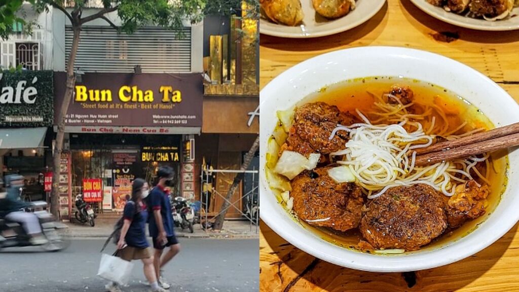 Un favori parmi les touristes, Bun Cha Ta propose une variété de cha et de nem frits. Le bun cha classique comprend du porc grillé tendre et fumé, des boulettes de viande bien assaisonnées et des nouilles de riz onctueuses dans un bouillon parfaitement équilibré.