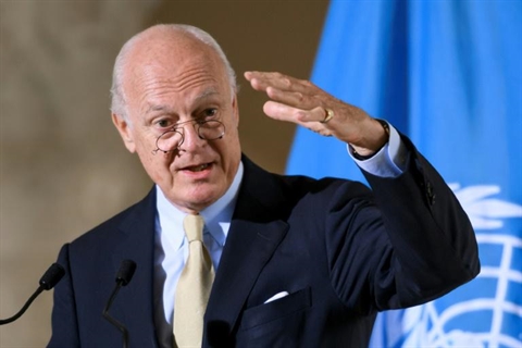 | L’envoyé spécial de l’ONU pour la Syrie, Staffan de Mistura, à l’issue d’une réunion du groupe de travail sur l’aide humanitaire en Syrie, à Genève le 15 septembre |