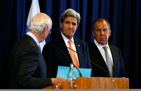 | Le secrétaire d’État américain John Kerry, lors d’une conférence de presse à l’issue d’une réunion avec son homologue russe Sergueï Lavrov (droite) et l’envoyé spécial de l’ONU pour la Syrie, Staffan de Mistura (de dos), à Genève le 9 septembre |