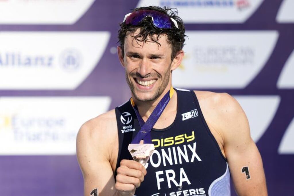 | Dorian Coninx après avoir remporté le bronze lors des championnats d'Europe de triathlon à Munich le 13 août 2022. |