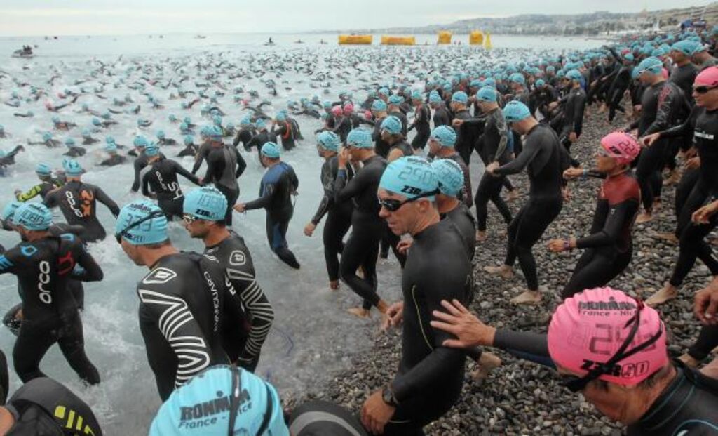 | Des triathlètes disputent l'épreuve de natation de l'Ironman de Nice, le 23 juillet 2017. |