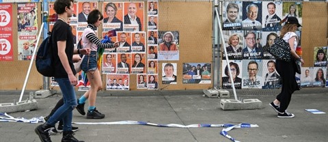 | Des passants devant des affiches électorales pour les scrutins du 26 mai 2019 en Belgique (photo prise le 18 mai 2019 à Bruxelles). |