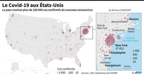 Des médecins new-yorkais s'inquiètent d'une possible pénurie de respirateurs artificiels. "S'il y a un afflux et que vous n'avez qu'un nombre limité de respirateurs, vous ne pouvez pas (aider) tout le monde", redoute Shamit Patel, 46 ans. L'épidémie s'est aussi déclarée à bord du porte-avions américain Theodore Roosevelt, amarré dans l'île de Guam, poussant son commandant à demander l'autorisation de débarquer et confiner tout son équipage. "Nous ne sommes pas en guerre. Il n'y a aucune raison que des marins meurent", a écrit le capitaine de vaisseau Brett Crozier.