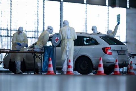 | Prise de tests sur des automobilistes dans un centre de dépistage drive-in à Hanovre (Allemagne), le 31 mai. |