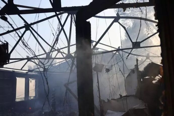 | Vue aérienne de la scène principale du festival Tomorrowland, détruite par un incendie, le 17 juillet 2025 à Boom, en Belgique. |