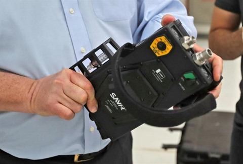 | James W. Teetzel, Pdg de l'entreprise américaine Wilcox, tient un respirateur sur un site de production de Barzan Holdings, à Doha, le 4 mai. |