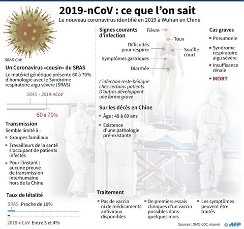 Les patients hospitalisés à Paris sont un couple "originaire de Wuhan" et qui était arrivé le 18 janvier en France pour un voyage. Le ministère a réitéré, notamment pour les "personnes qui auraient séjourné en Chine récemment", les précautions à prendre en cas de symptômes, fièvre et toux ou difficultés respiratoires : contacter le Samu (15) et ne pas se rendre chez son médecin traitant ou aux urgences, pour éviter toute potentielle contamination.