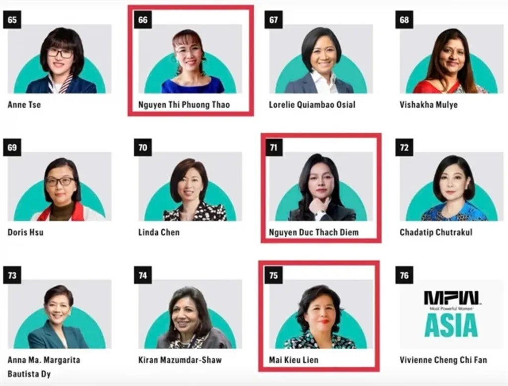 Le magazine Fortune vient d’annoncer la liste de MPW Asia 2024, qui honore les 100 meilleures femmes d’affaires dans de nombreux domaines, notamment la finance, l’énergie, les transports, l’alimentation et les boissons et la restauration - hôtellerie.